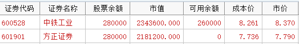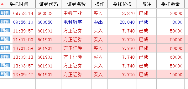 吃好中饭,看了一下自选股,决定买方正证券,11点39分委托了一笔卖一价7.74是必然成交,然后挂了一笔买一价7.73等待。