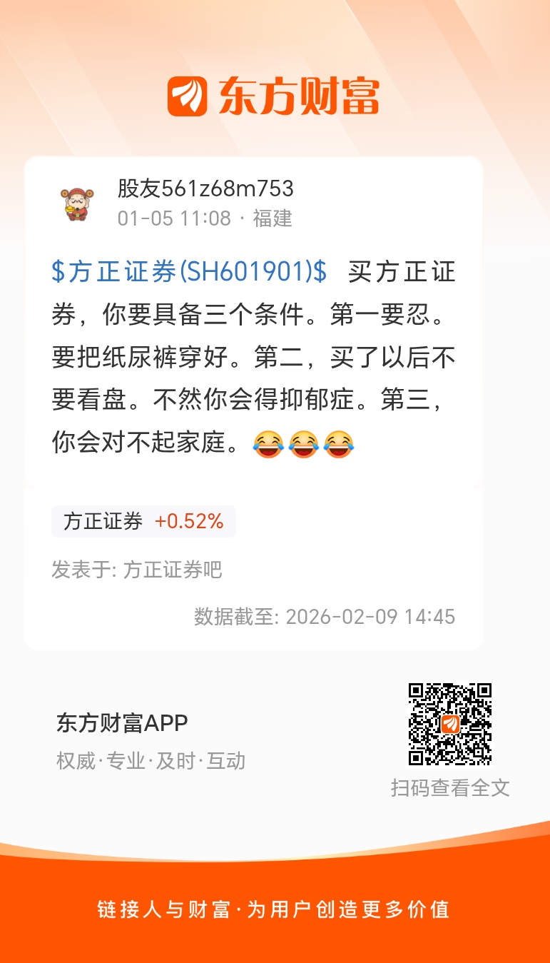 $方正证券(SH601901)$ 买方正证券,你要具备三个条件。第一要忍。要把纸尿裤穿好。第二,买了以后不要看盘。不然你会得抑郁症。第三,你会对不起家庭。