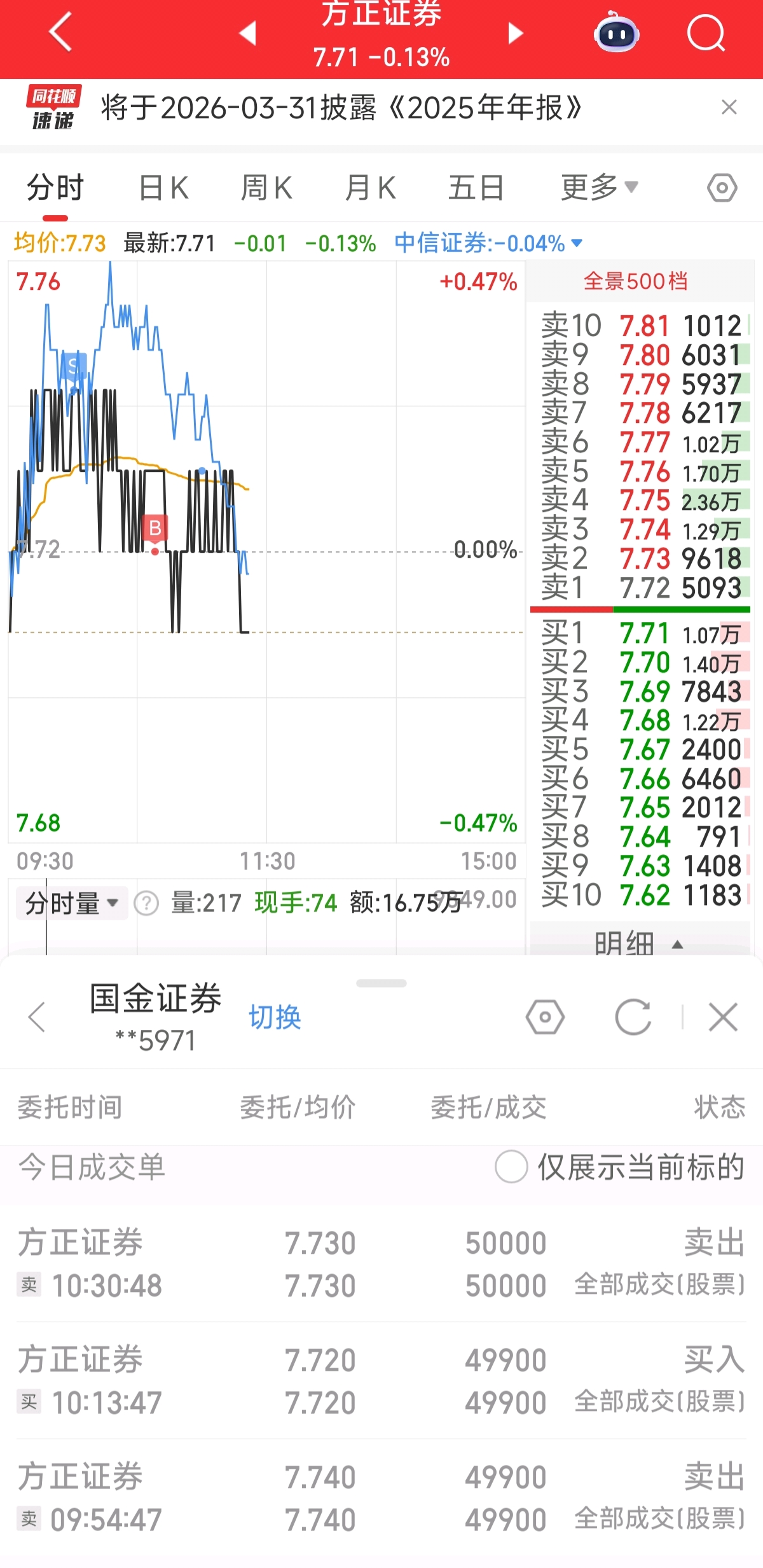$方正证券(SH601901)$ 感觉不对劲,7.73卖了500手。进不进就看下午了。大盘太差。