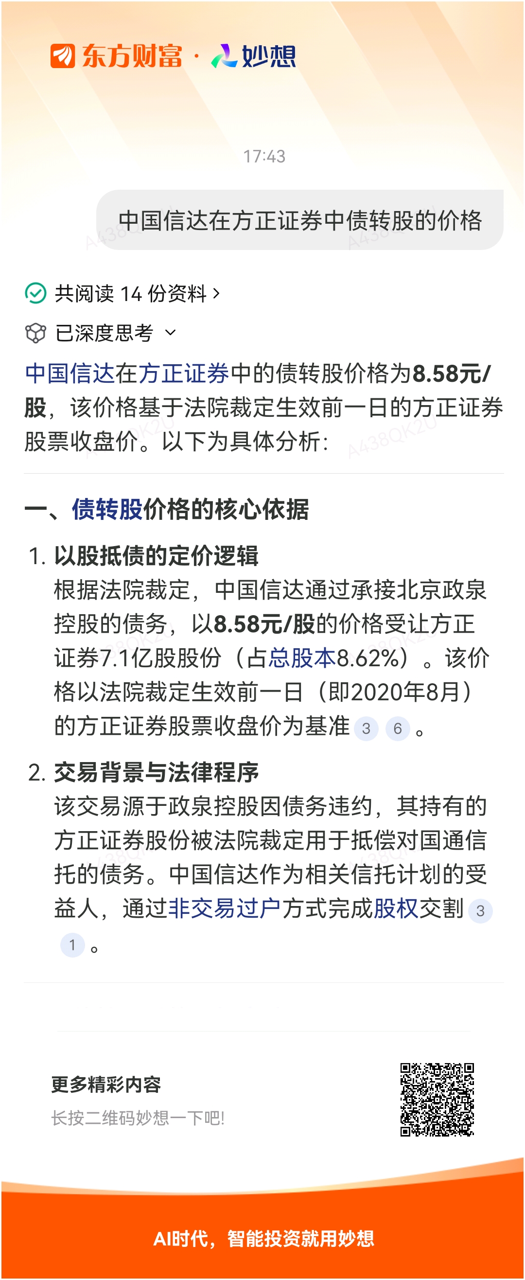 #@妙想,你怎么看?# 妙想一下:中国信达在方正证券中债转股的价格
