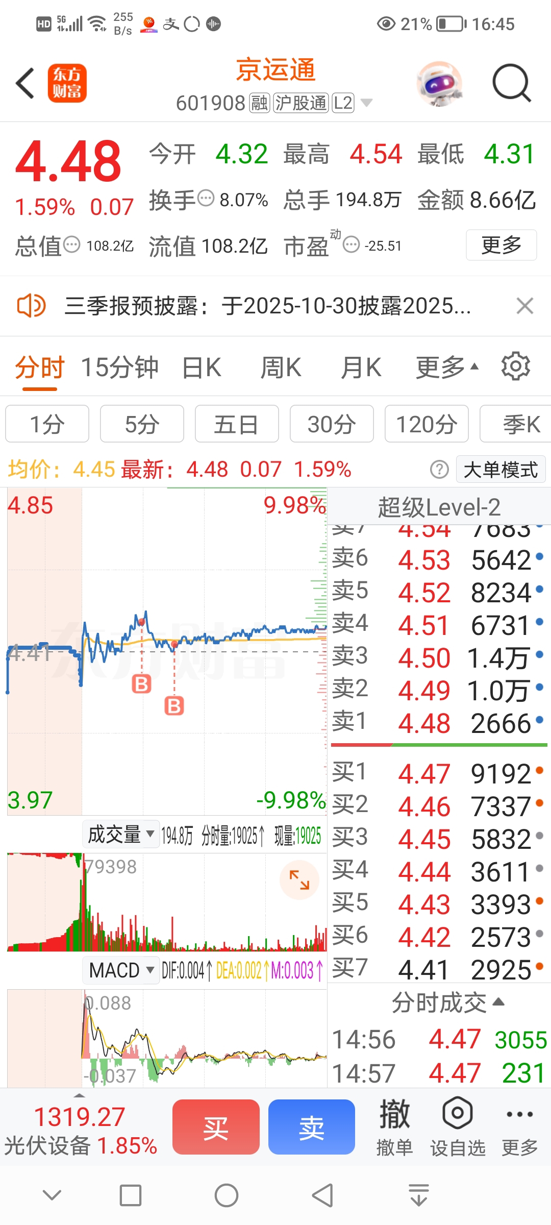 $京运通(SH601908)$ 周一406买入,昨天4.51卖了,今天看承接不错继续支持,,本周过5就是开启大行情啦,,,