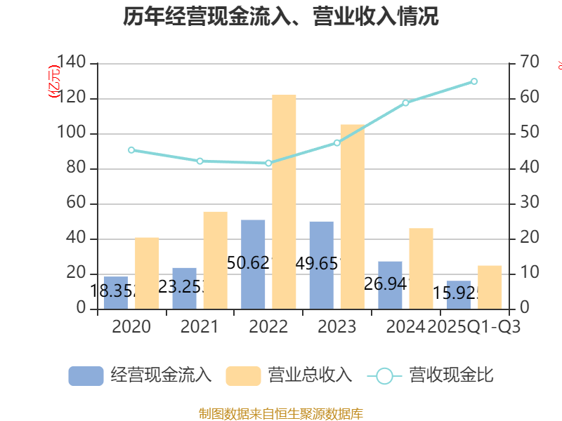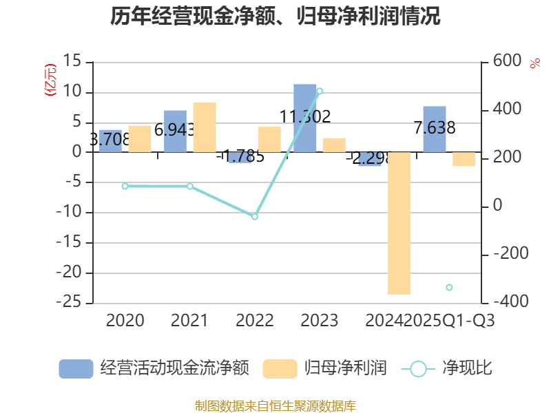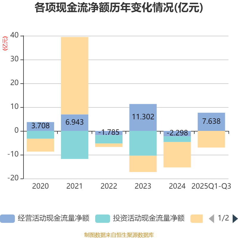 2025年前三季度,公司经营活动现金流净额为7.64亿元,同比增加11.07亿元;筹资活动现金流净额-6.99亿元,同比减少2.87亿元;投资活动现金流净额-1.4万元,上年同期为-2.56亿元。