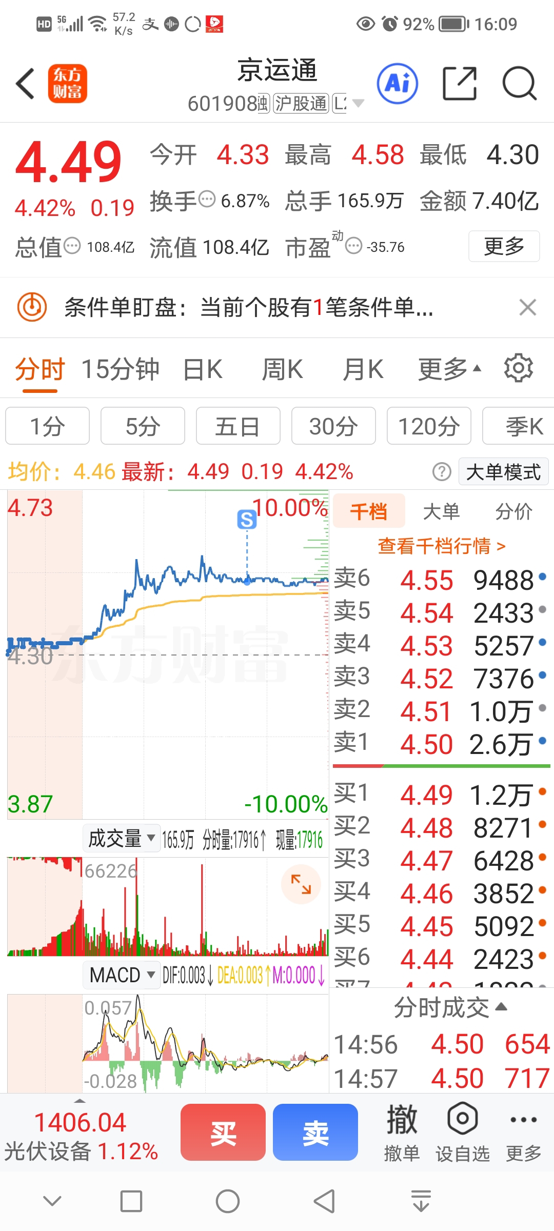 $京运通(SH601908)$ 今日不触板,不进则退明天要回调啦,4.45之下机会是有的