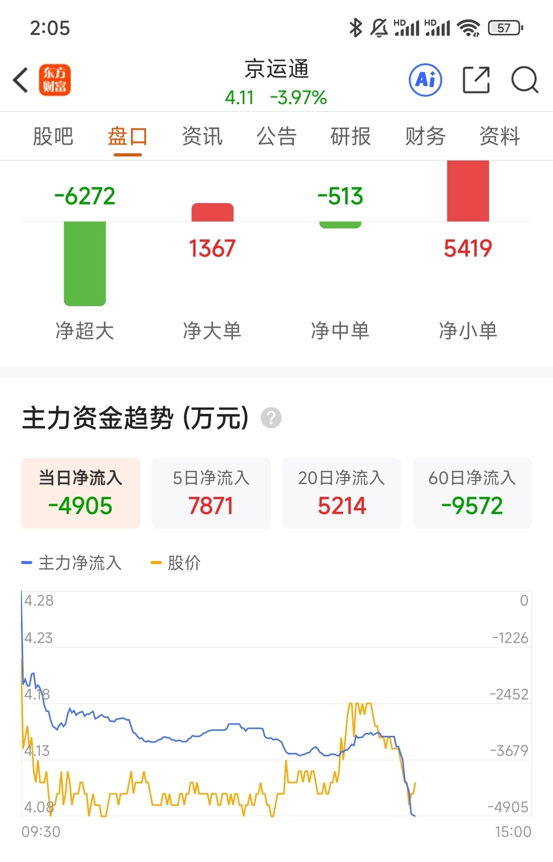 $京运通(SH601908)$ 从今天的股价及主力资金图,可以看出,开盘股价快速下跌的同时主力资金也快速离场,随后横盘整理,再下跌,股价尾盘是否还有可能回升,将决定我是否在做春秋大梦