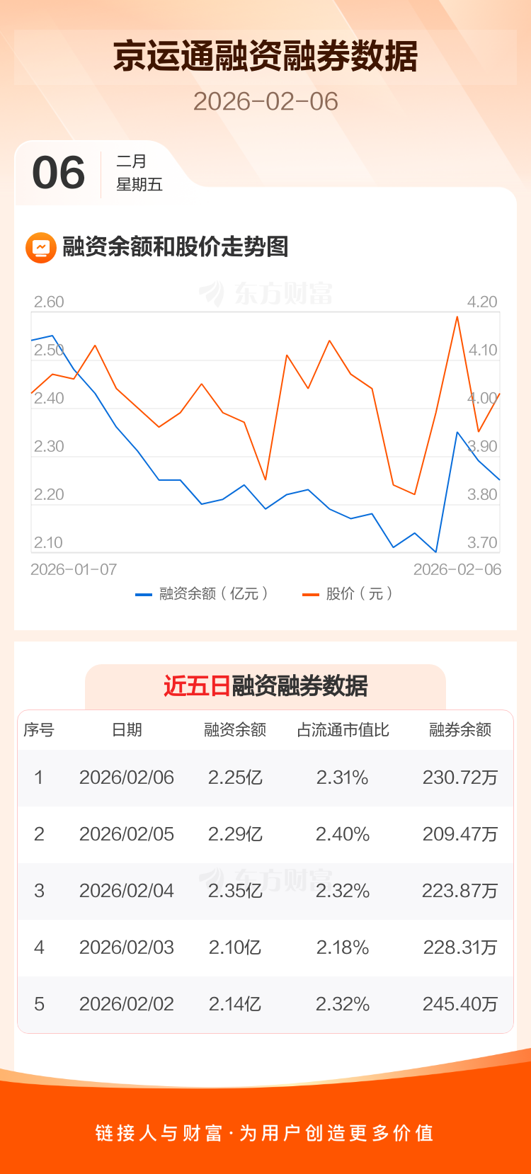 交易所最新数据显示,京运通于2026年2月6日获融资买入2801.21万元,融资偿还3231.77万元,当日融资净偿还430.55万元。目前,该股融资余额2.25亿,占流通市值比例为2.31%。