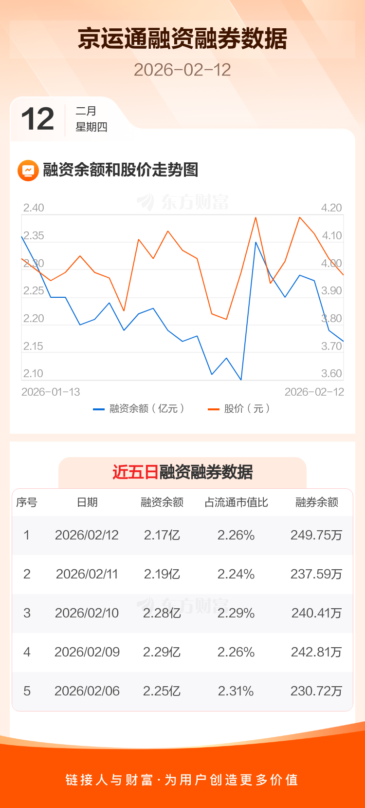 交易所最新数据显示,京运通于2026年2月12日获融资买入2192.96万元,融资偿还2341.73万元,当日融资净偿还148.77万元。目前,该股融资余额2.17亿,占流通市值比例为2.26%。