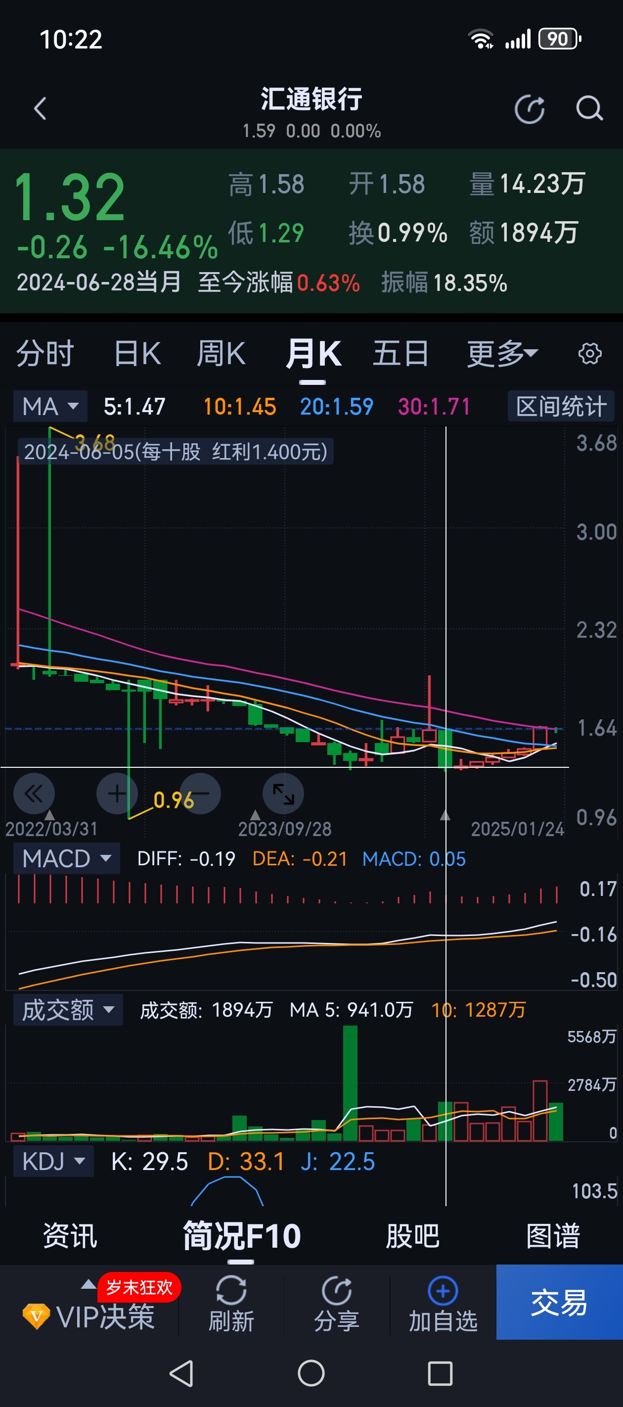 汇通银行其实也不错的每年分红0.14,股价才这么一丢丢,能在主板上市,股价立马涨