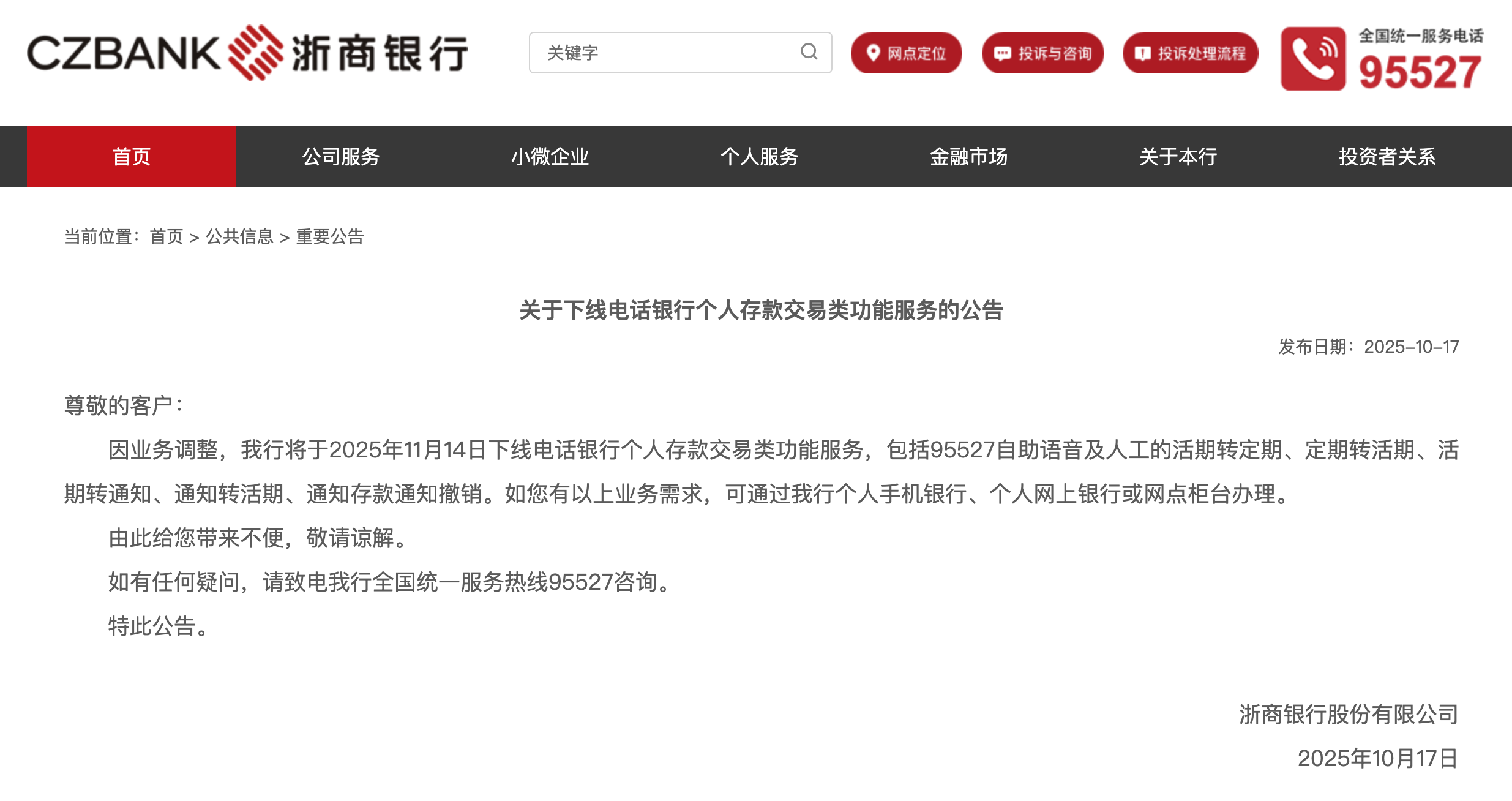 10月17日,浙商银行发布公告称,因业务调整,该行将于2025年11月14日下线电话银行个人存款交易类功能服务,包括95527自助语音及人工的活期转定期、定期转活期、活期转通知、通知转活期、通知存款通知撤销。如客户有以上业务需求,可通过该行个人手机银行、个人网上银行或网点柜台办理。