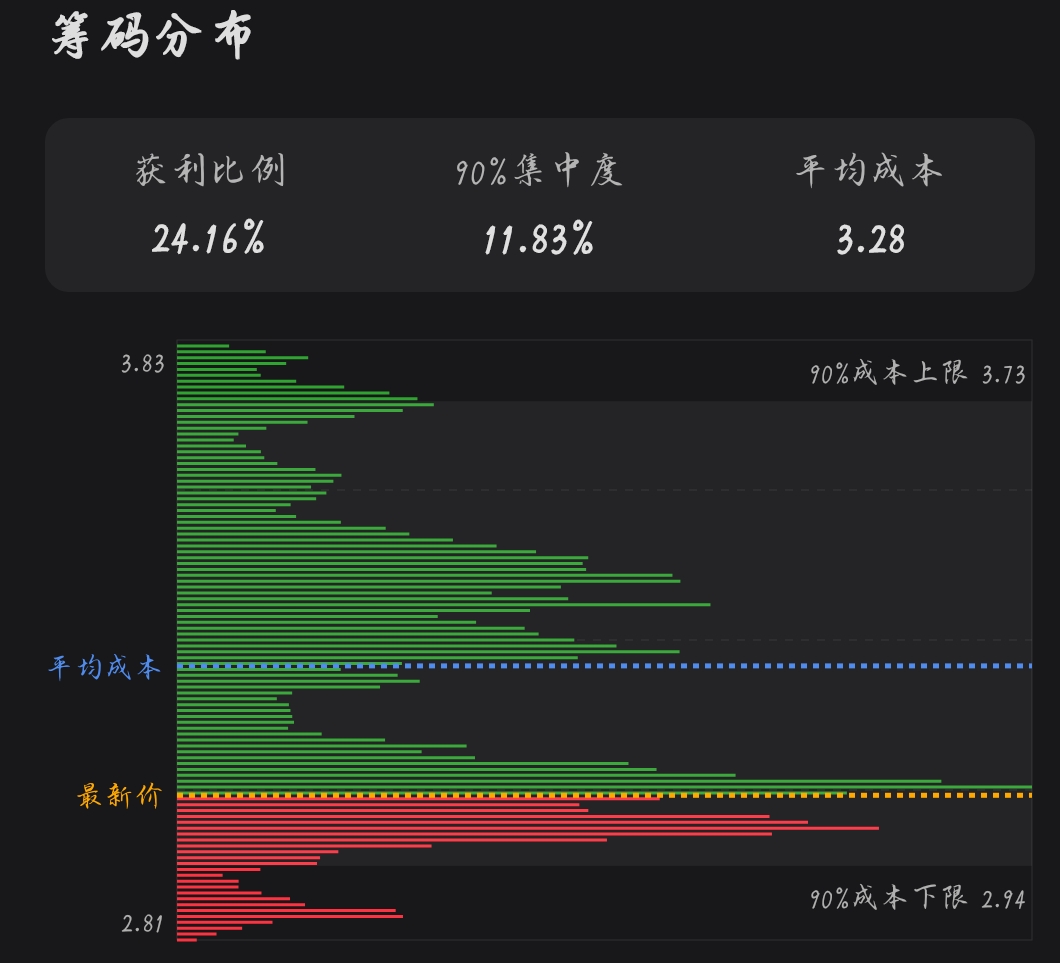 首先呢看它的平均成本价3.28,目前的价格还是低位值得购买,在一个从下面我粘贴的