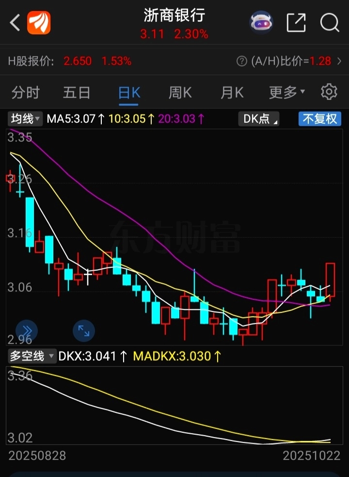 《日K线解读》5日上穿10日,10日上穿20日,均线成多头排列,多空线指标底部金
