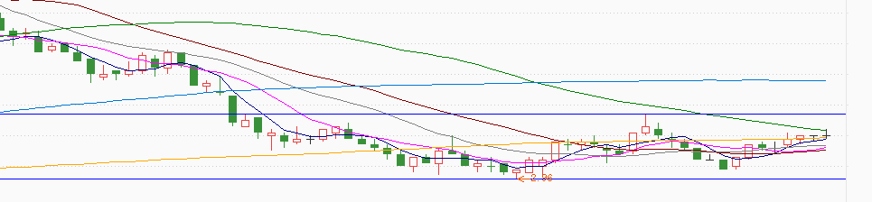 此股短期底部就是在年线3元附近,第一阻力位在3.14左右,目前箱体震荡趋势。如果突破,可看到3.3左右!