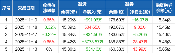 融资方面,当日融资买入7189.33万元,融资偿还8181.29万元,融资净偿还991.96万元。融券方面,融券卖出2.46万股,融券偿还18.53万股,融券余量176.6万股,融券余额549.23万元。融资融券余额合计15.34亿元。