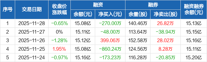 浙商银行:融资净偿还270万元,融资余额15.08亿元(11-28)