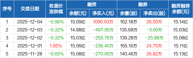 融资方面,当日融资买入6810.58万元,融资偿还5719.65万元,融资净买入1090.93万元。融券方面,融券卖出37.91万股,融券偿还11.41万股,融券余量162.18万股,融券余额499.51万元。融资融券余额合计15.14亿元。