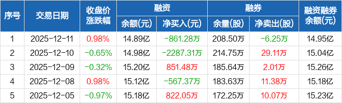 浙商银行:融资净偿还861.28万元,融资余额14.89亿元(12-11)