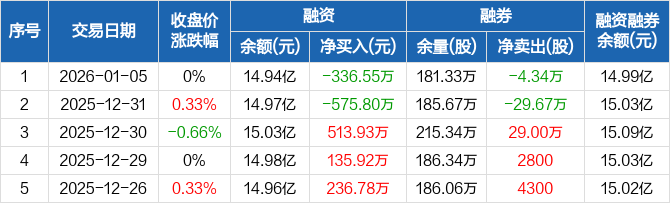 浙商银行:融资净偿还336.55万元,融资余额14.94亿元(01-05)