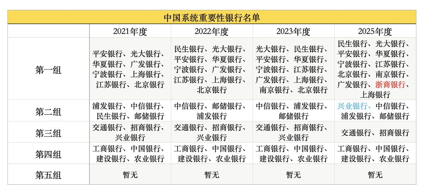 相较于此前披露的2023年度名单,在本次名单中,浙商银行首次入选、位于第一组,成为第10家入选的股份制商业银行;另一家股份制商业银行兴业银行从第三组调整至第二组。