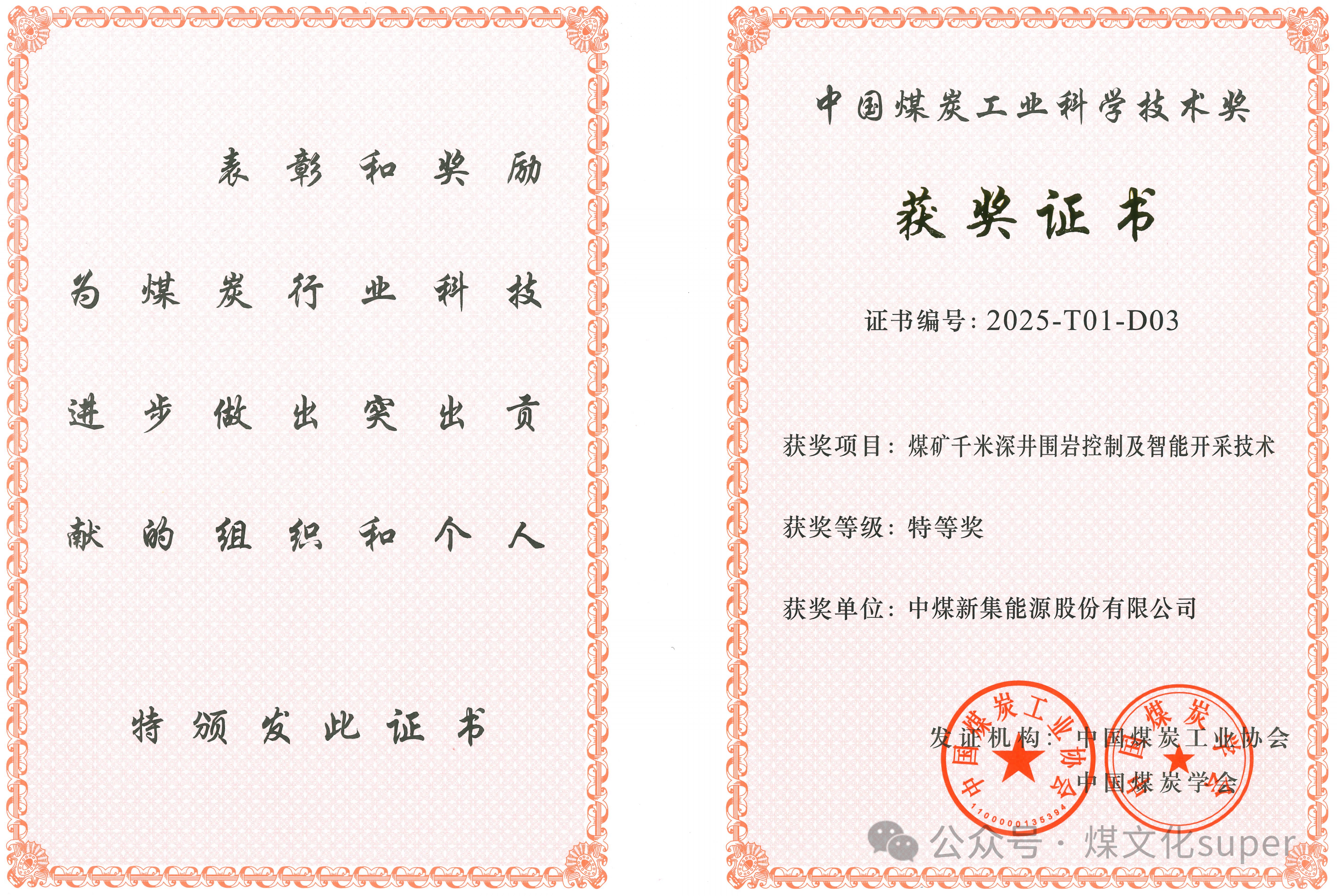 昨天,煤炭产业发展大会在北京召开,中国煤炭工业协会、中国煤炭学会联合发布2025年度科学技术奖获奖名单,中煤新集“煤矿千米深井围岩控制及智能开采技术”获中国煤炭工业科学技术奖 特等奖。