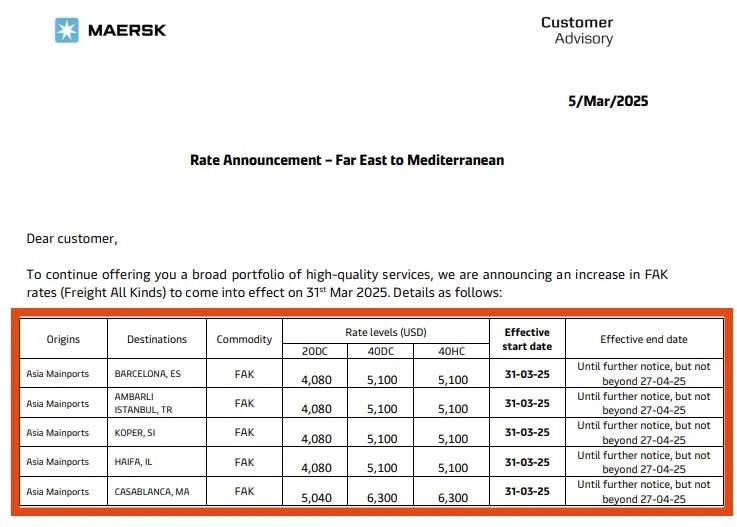 $中远海控(SH601919)$ 近日,已有船公司开始公布2025年4月的运价调整计划。具体而言,马士基于日前发布了一则公告,宣布为了持续为客户提供广泛的高质量服务组合,将从2025年3月31日起,上调远东至地中海航线的FAK费率。其中,20尺标准箱的费率最高将调整至5040美元,而40尺标准箱的费率最高则将达到6300美元。