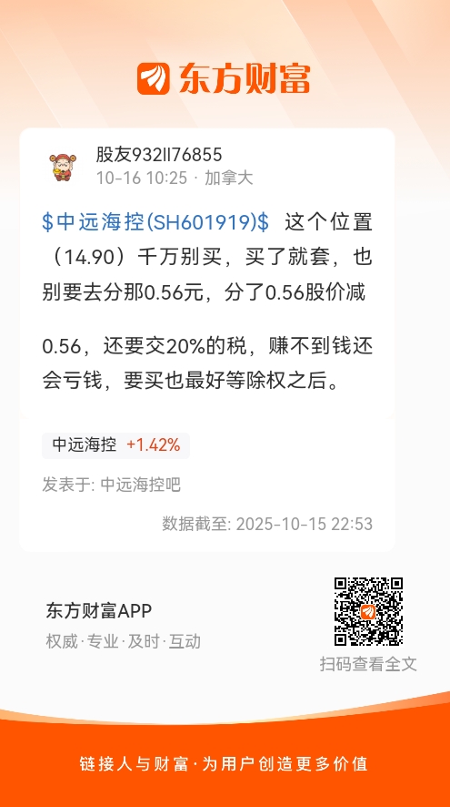$中远海控(SH601919)$ 这个位置(14.90)千万别买,买了就套,也别要去分那0.56元,分了0.56股价减