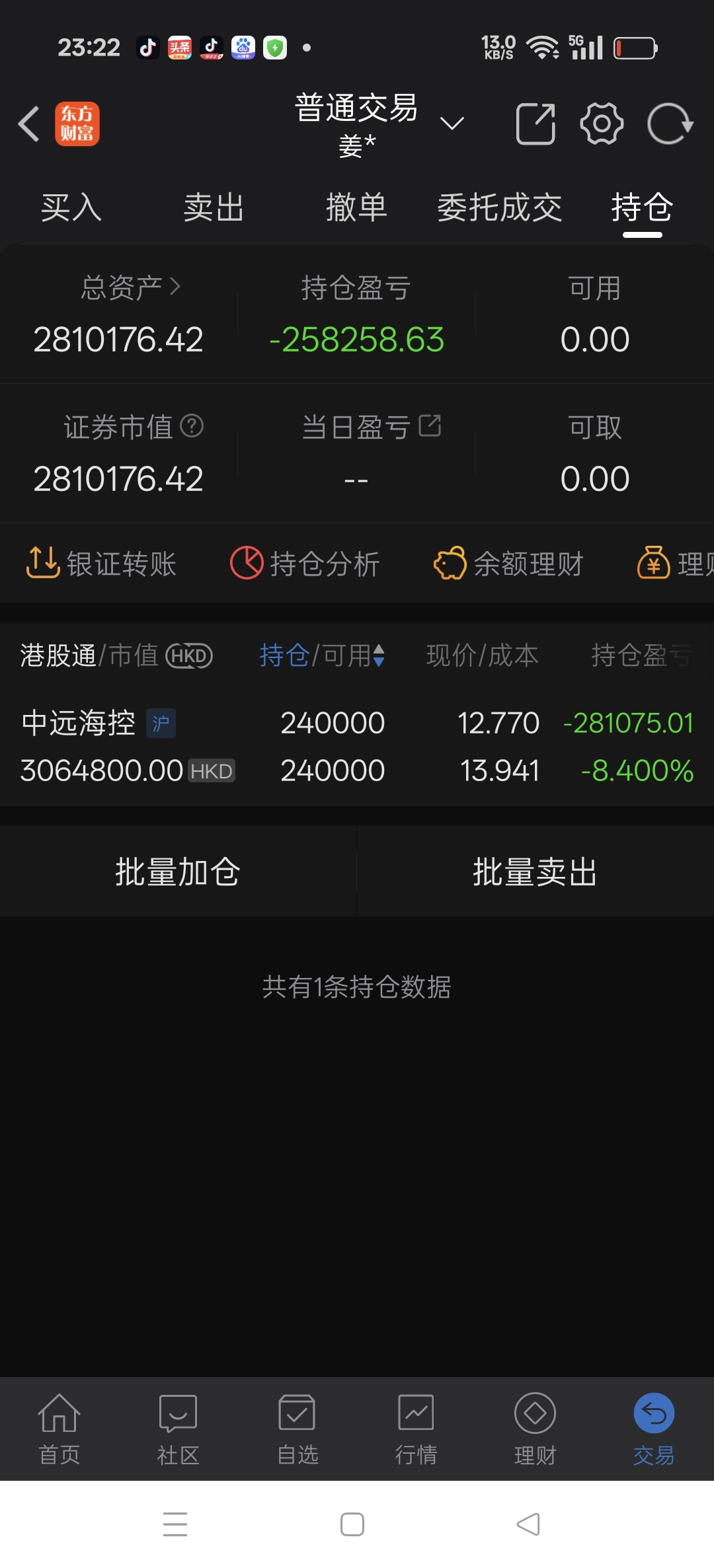 H股最高点买的中远海控还亏8个点,前几天亏60多万了,我就不看盈亏,24万股死拿
