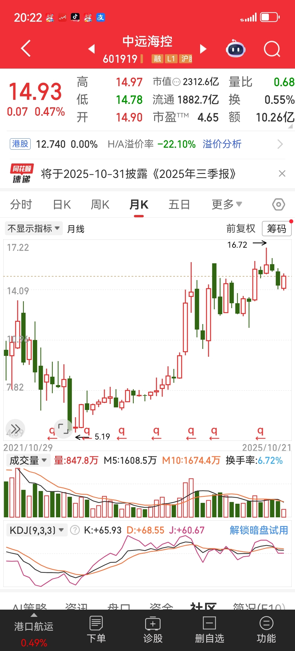 在我的交易系统里是没有均线的,我也不看任何指标,先说结论,我判断明年5月末中远海控股价将达到20元。任何资产都离不开量价时空四个字。如此确定的收益此时这么便宜不买,更待何时呢?我将在今日头条上,分享我的心得。