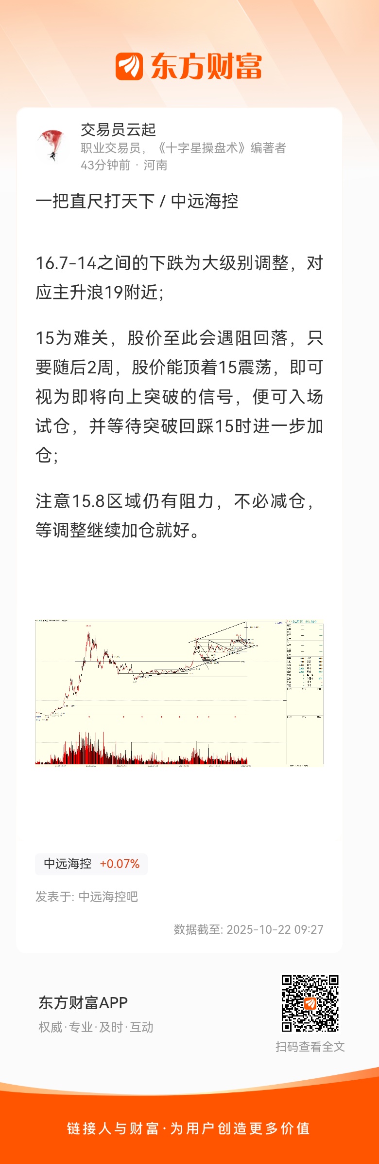 15为难关,股价至此会遇阻回落,只要随后2周,股价能顶着15震荡,即可视为即将向上突破的信号,便可入场试仓,并等待突破回踩15时进一步加仓;