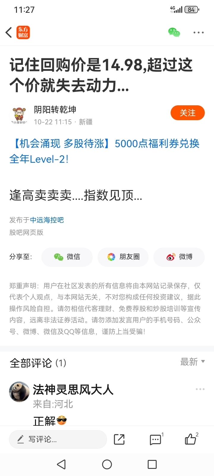 温馨提示: 1.根据《证券法》规定,禁止编造、传播虚假信息或者误导性信息,扰乱证券市场;2.用户在本社区发表的所有资料、言论等仅代表个人观点,与本网站立场无关,不对您构成任何投资建议。用户应基于自己的独立判断,自行决定证券投资并承担相应风险。《东方财富社区管理规定》