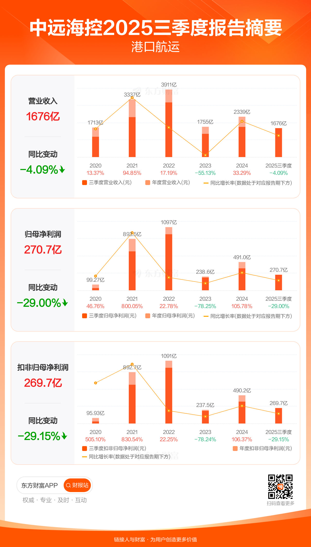 中远海控10月31日发布2025年三季报显示,公司前三季实现营业收入1675.99亿元,同比下滑4.09%;归母净利润270.70亿元,同比下滑29.00%;扣非归母净利润269.65亿元,同比下滑29.15%。