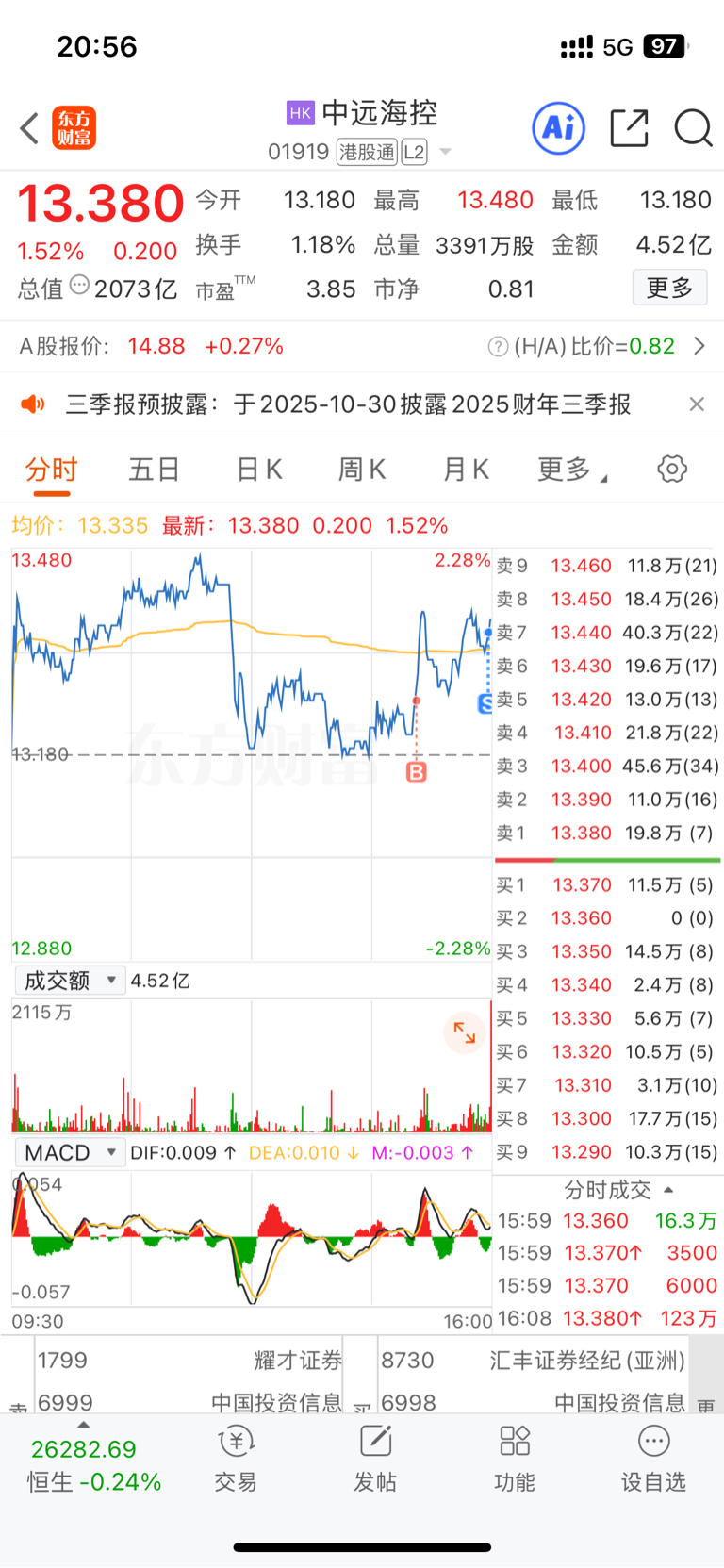 $中远海控(SH601919)$ 我想抽死自己,3点零几分看到关税和301新闻赶紧去港股加仓1万港股,加仓后市场没啥反应,担心晚上季报不及预期,手里海控又快满仓了,一害怕又给卖了