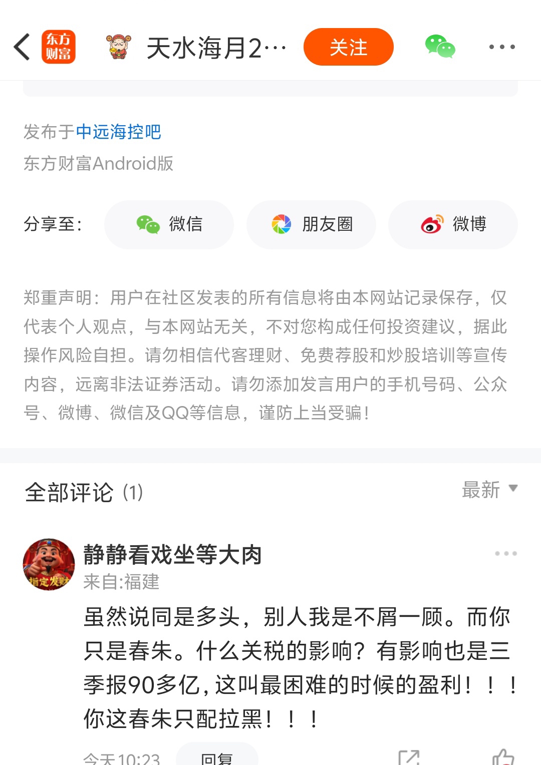 $中远海控(SH601919)$ 道不同不相为谋!春朱们只配拉黑。一不爽直接拉黑,大A年年盈利的我不需要不同声音