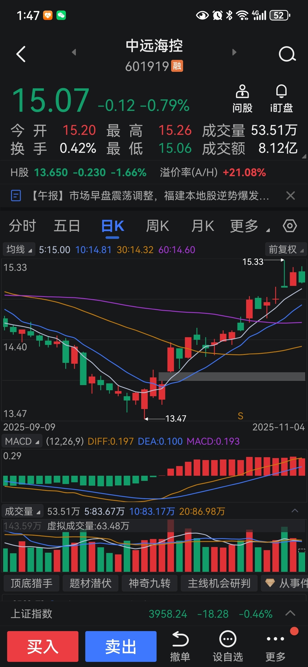 快了!还有3个点就到成本价了!中远真的是离成本禁沟远!