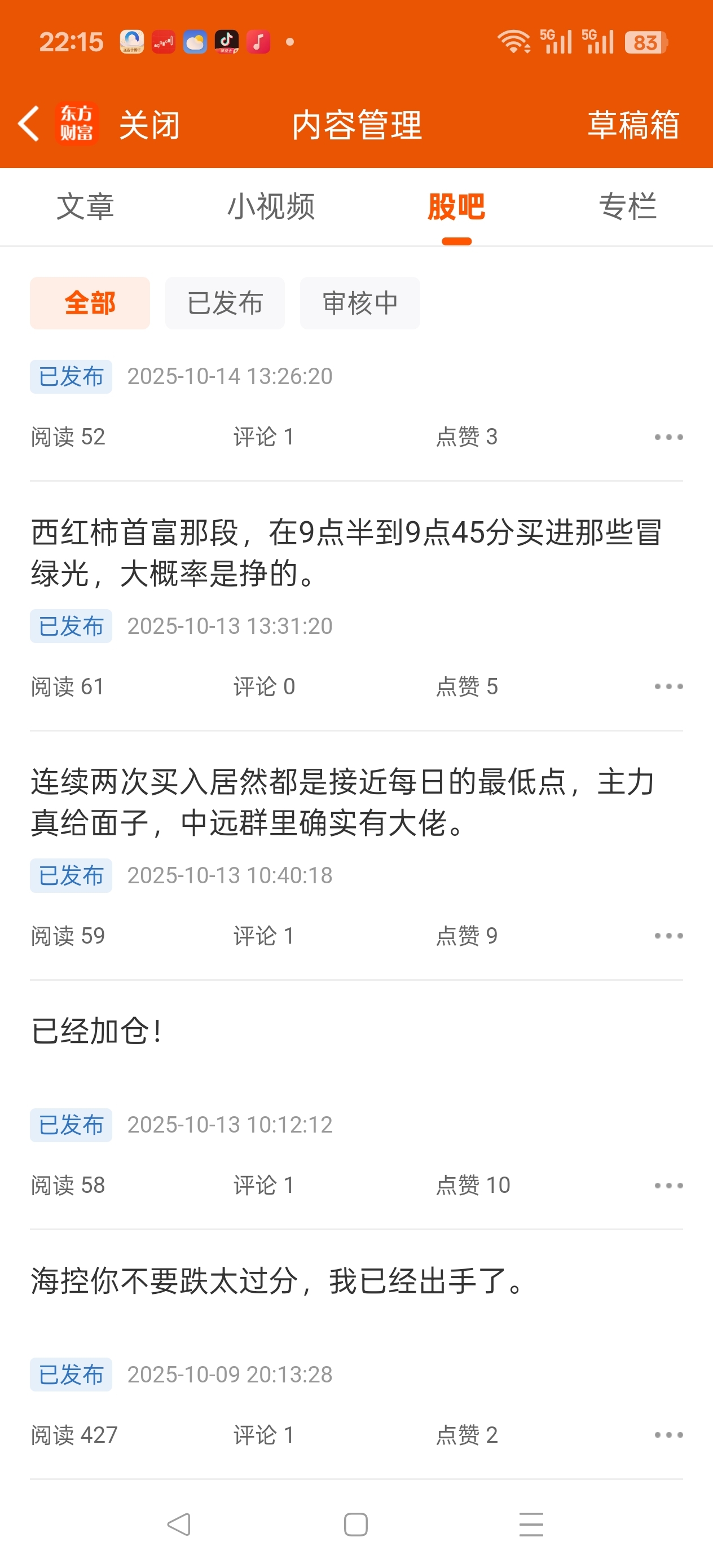最近我很少发帖,因为已经企稳了。我从股吧里的大佬获意良多,因此在这波回调最低点开