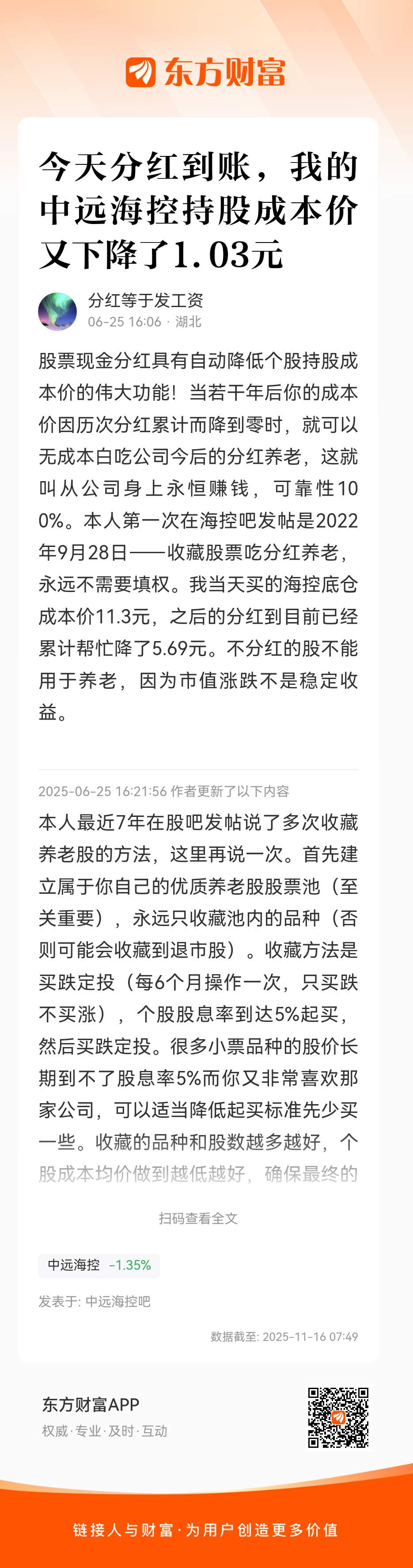 股票现金分红具有自动降低个股持股成本价的伟大功能!当若干年后你的成本价因历次分红累计而降到零时,就可以无成本白吃公司今后的分红养老,这就叫从公司身上永恒赚钱,可靠性100%。本人第一次在海控吧发帖是2022年9月28日——收藏股票吃分红养老,永远不需要填权。我当天买的海控底仓成本价11.3元,之后的分红到目前已经累计帮忙降了5.69元。不分红的股不能用于养老,因为市值涨跌不是稳定收益。