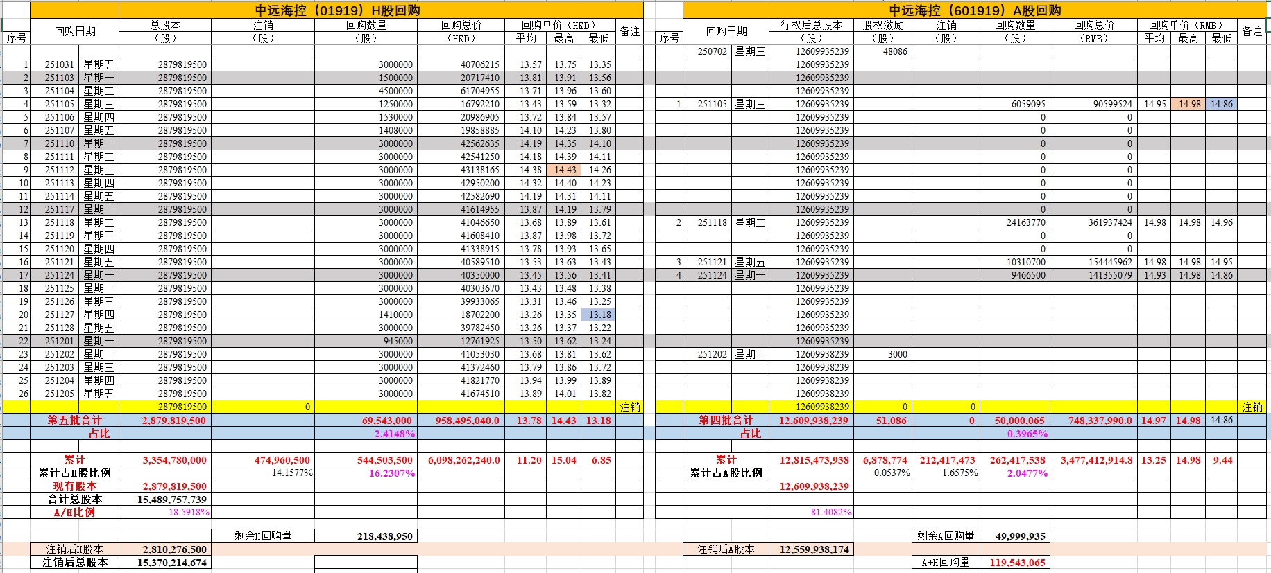 截止12月5日,中远海控累计回购H股6954.3万股,A股5000万股。按以往经