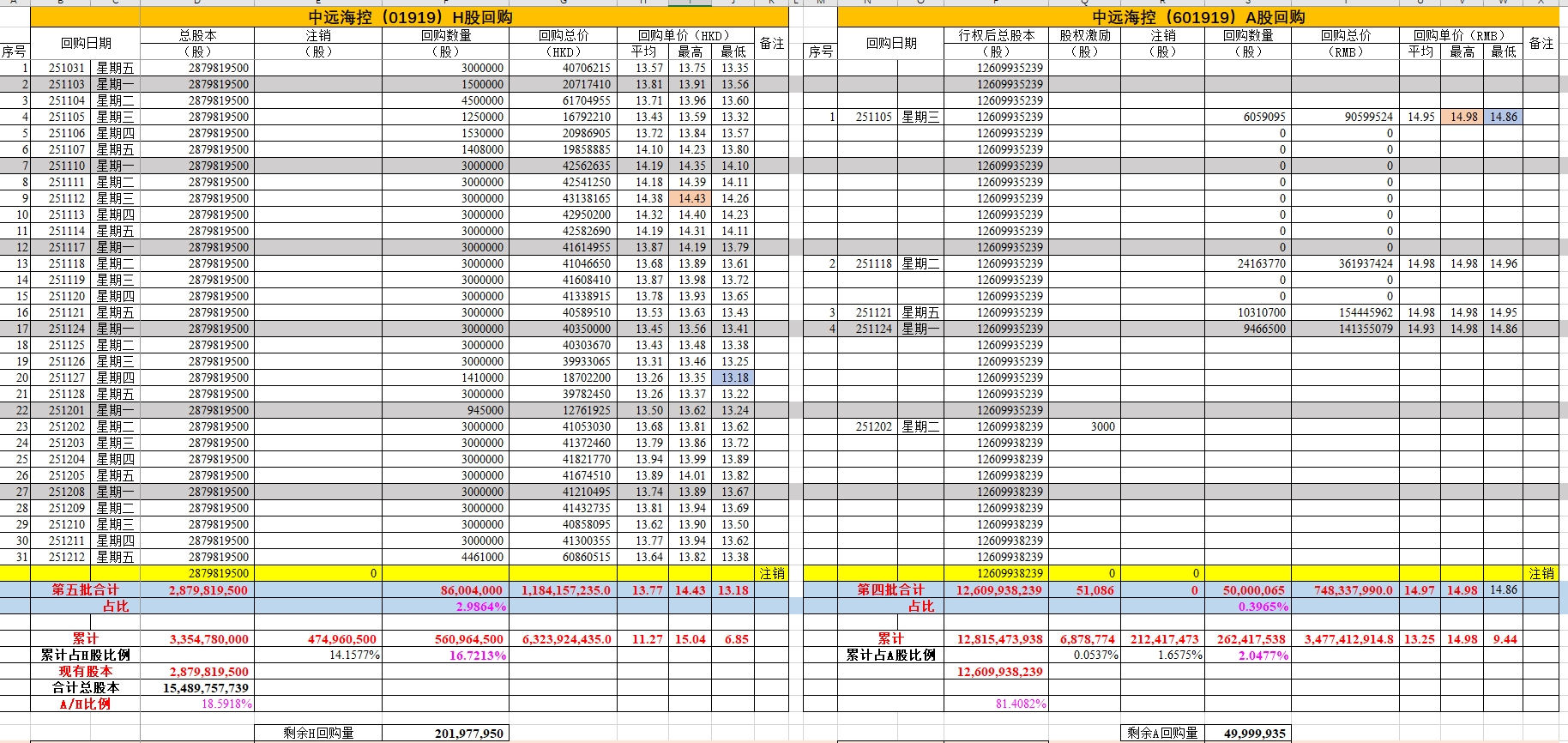 中远回购:截止双十二,累计回购H股8600万股,A股5000万股。