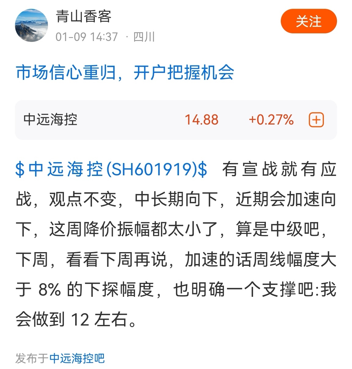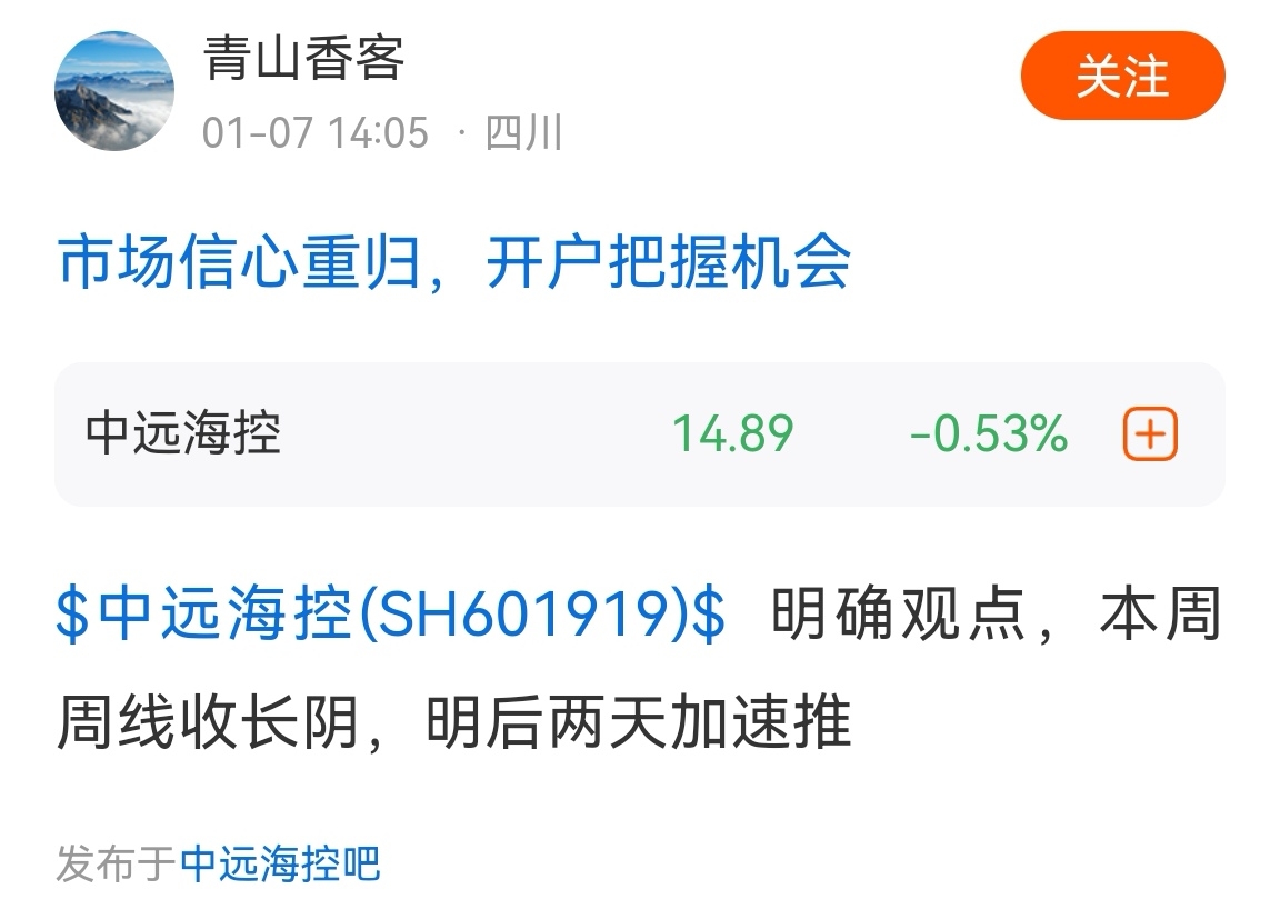 $中远海控(SH601919)$ 这是脑袋里面灌满了假酒才会如此的无脑唱空,@疯狂 摩擦 不敢犬吠具体啥时候大跌了,@青山 香客依然是死鸭子嘴硬,又是下周(好多个下周咯,青山臭客,下周复下周,下周何其多,哈哈)周线中长阴(备注:它自己说的周线中长阴是跌幅8%以上),那么下周我依然继续坐看它狗脸被再次(已经很多次了)打肿!!!