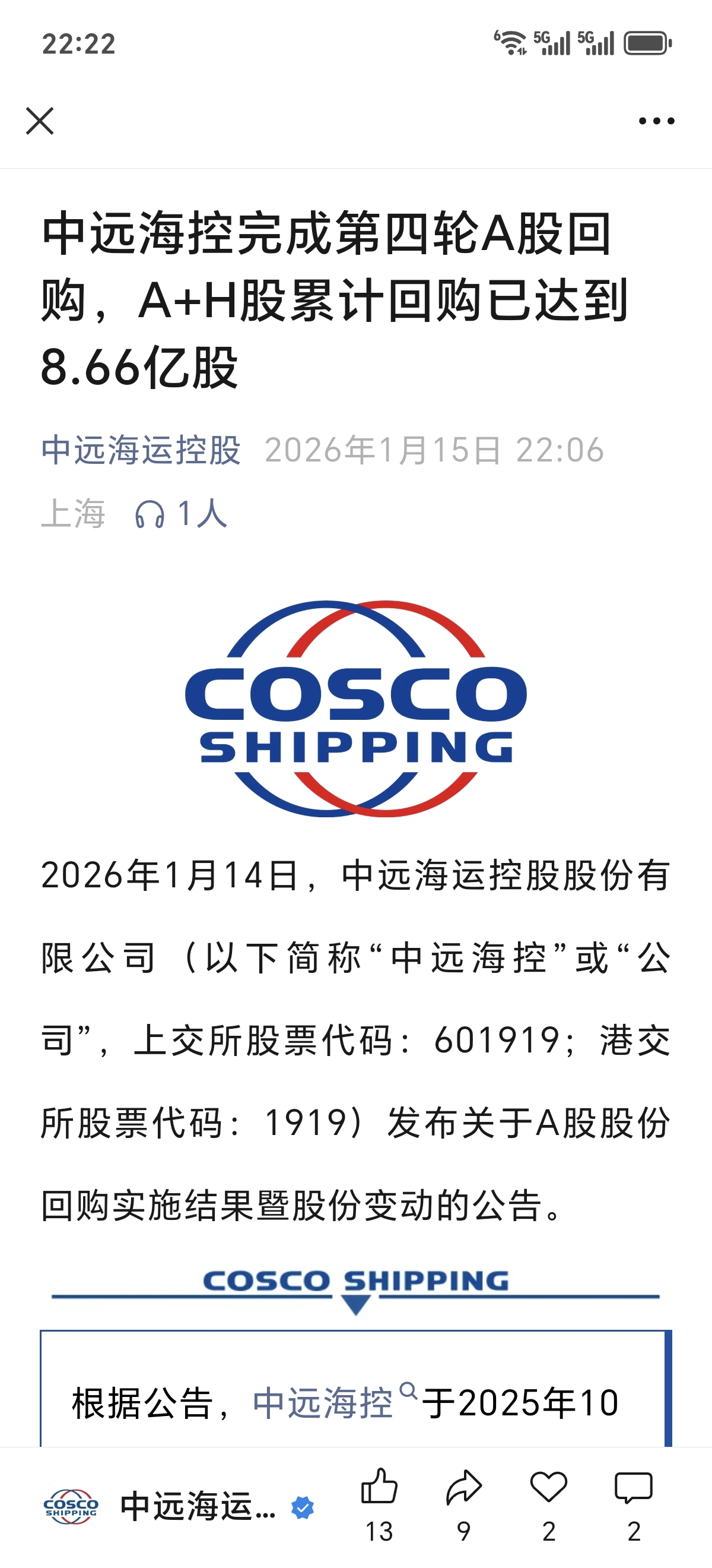 $中远海控(SH601919)$ 看来港股只是不明原因的暂停回购了,慢慢熬吧,希望守得云开见月明。
