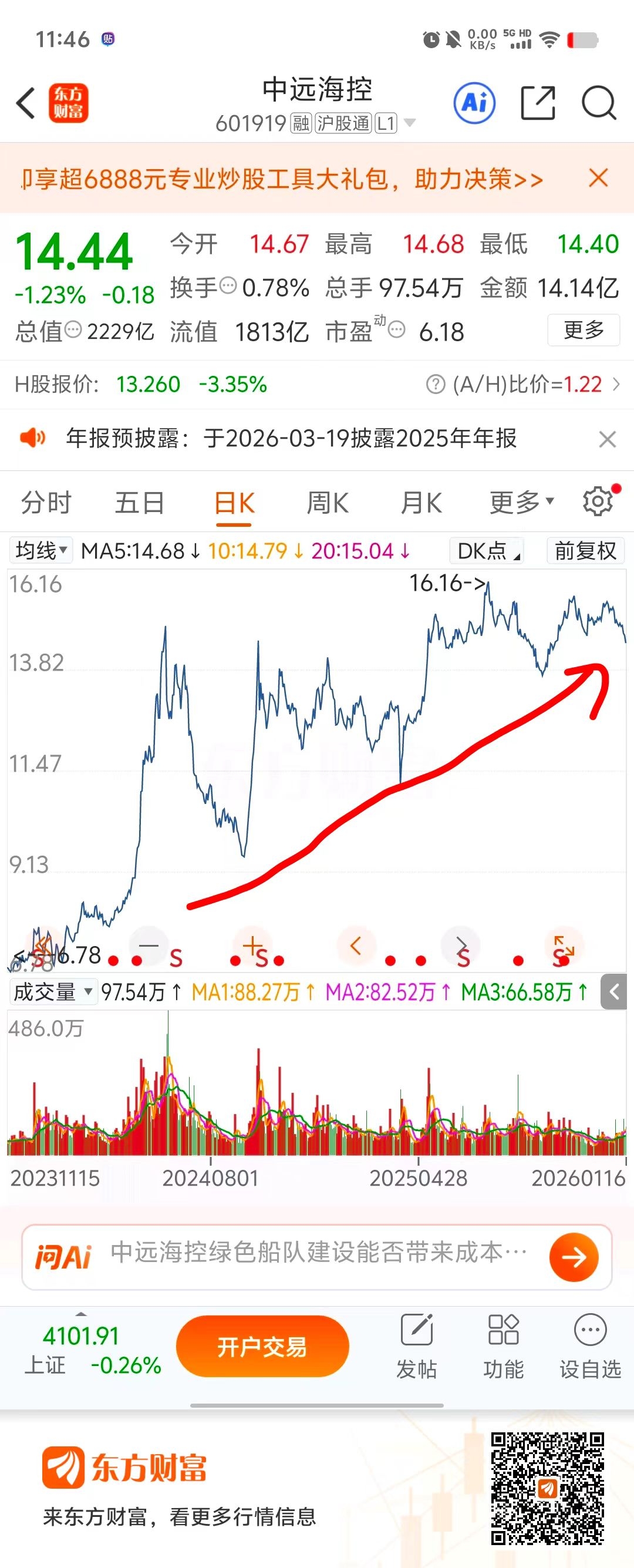 $中远海控(SH601919)$ $中远海控(HK|01919)$ 从日线上来看底部是不断提升的,那些想跌倒13.5捡便宜的,我建议洗洗睡吧,之前301,关税大战利空不比现在的红海复航这个更厉害吗,等3月份业绩出来净资产还要变成15.5,算上港股回购还没注销预估净资产会到15.6,一季度业绩预估也有80亿,5月份净资产就会达到16元,现在买都是捡便宜了