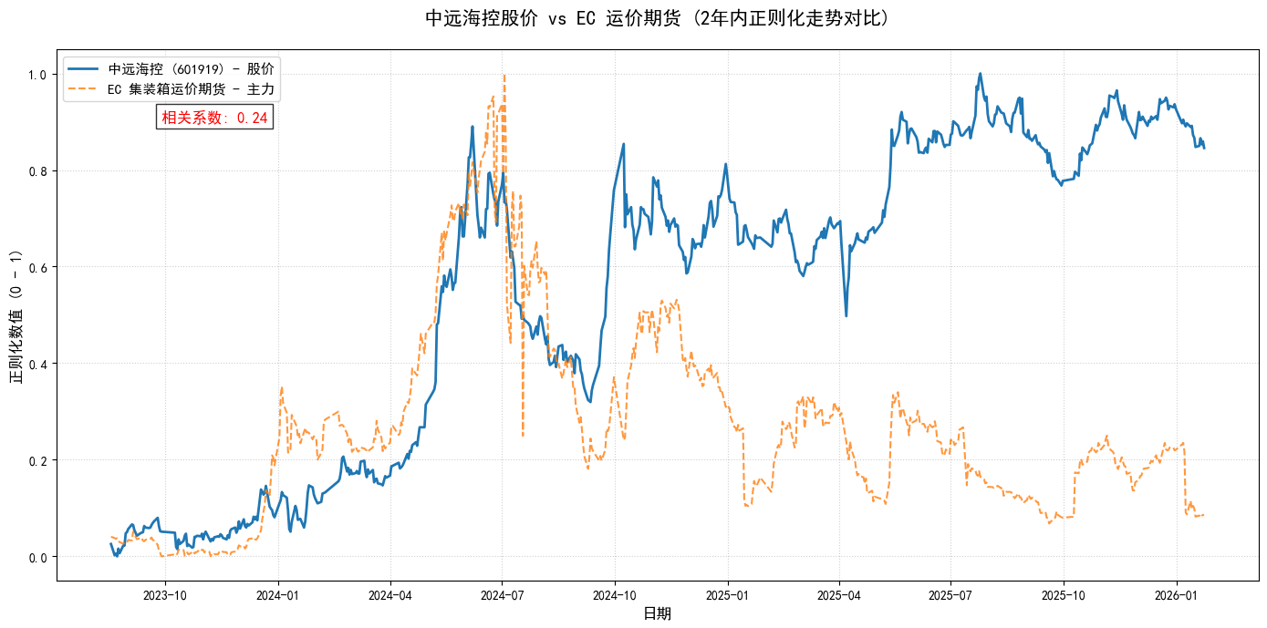 被套。周末分析了下EC期货价格和海控走势。在一张图里正则化了两条曲线。