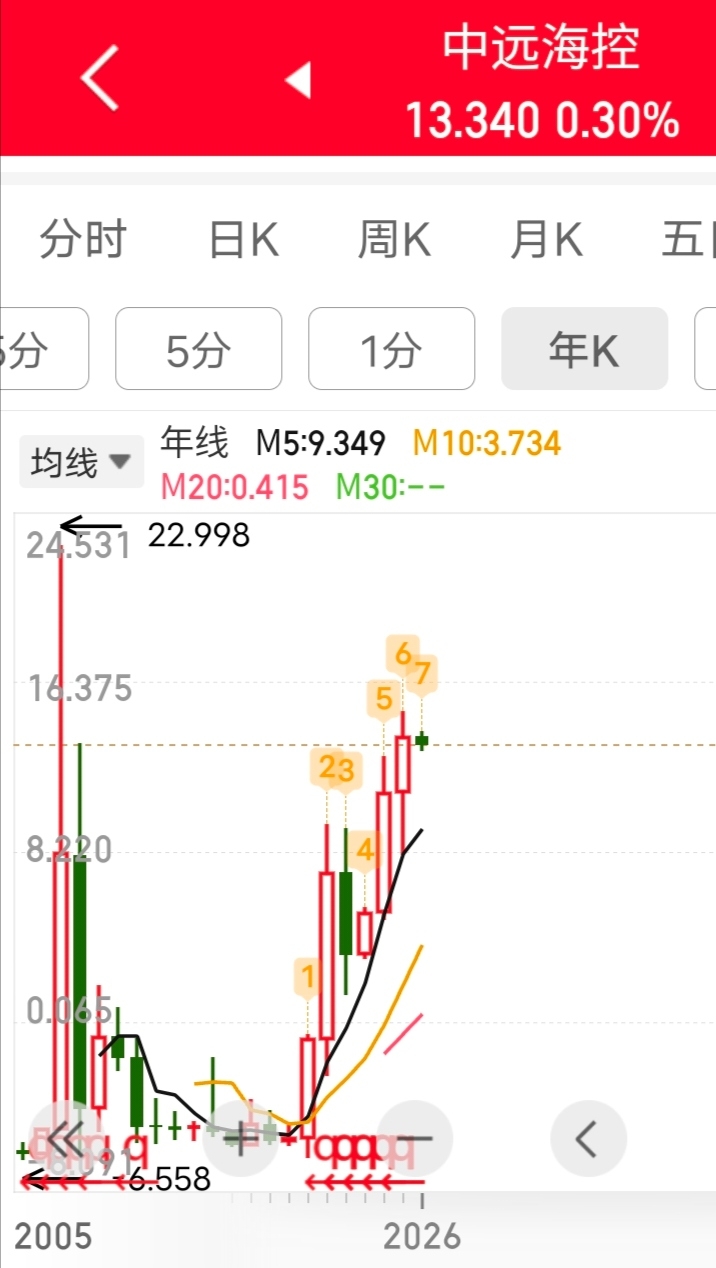 $中远海控(SH601919)$ 看到吧里有稳的,有着急的。其实大家可以看看它的年K线图,就知道它为什么就涨不动了。如果不继续突破,就会形成新的头部!