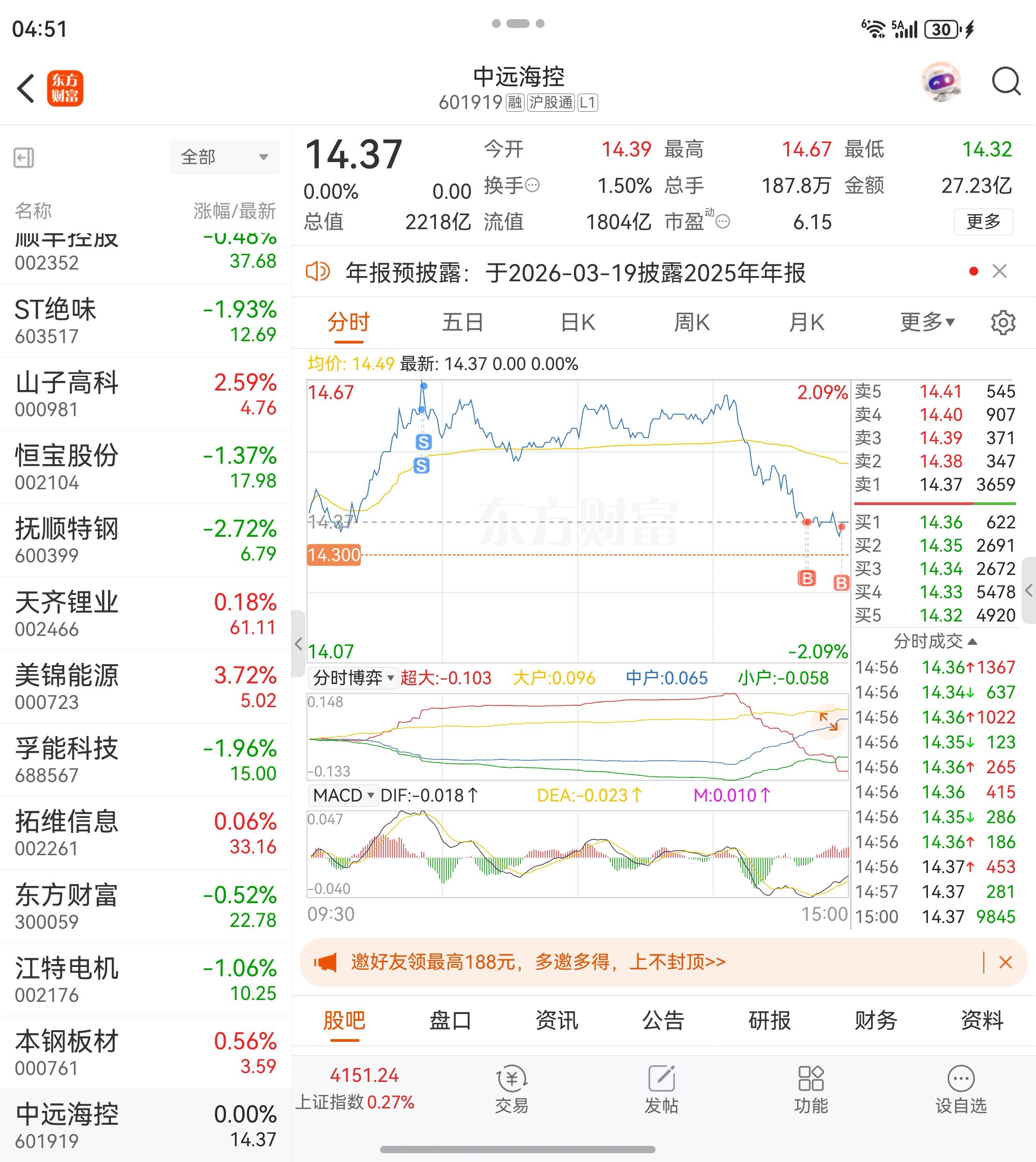 $中远海控(SH601919)$ 早上卖了,尾盘买回来了,看它明天咋样,哈哈哈