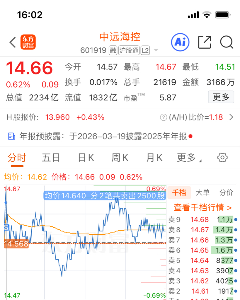 $中远海控(SH601919)$ $中远海控(HK|01919)$ 因要补充个人现金流,且对部分股份进行获利了解,今日卖出2500股,目前仍然持有61000股,仓位72.4%,进可攻退可守