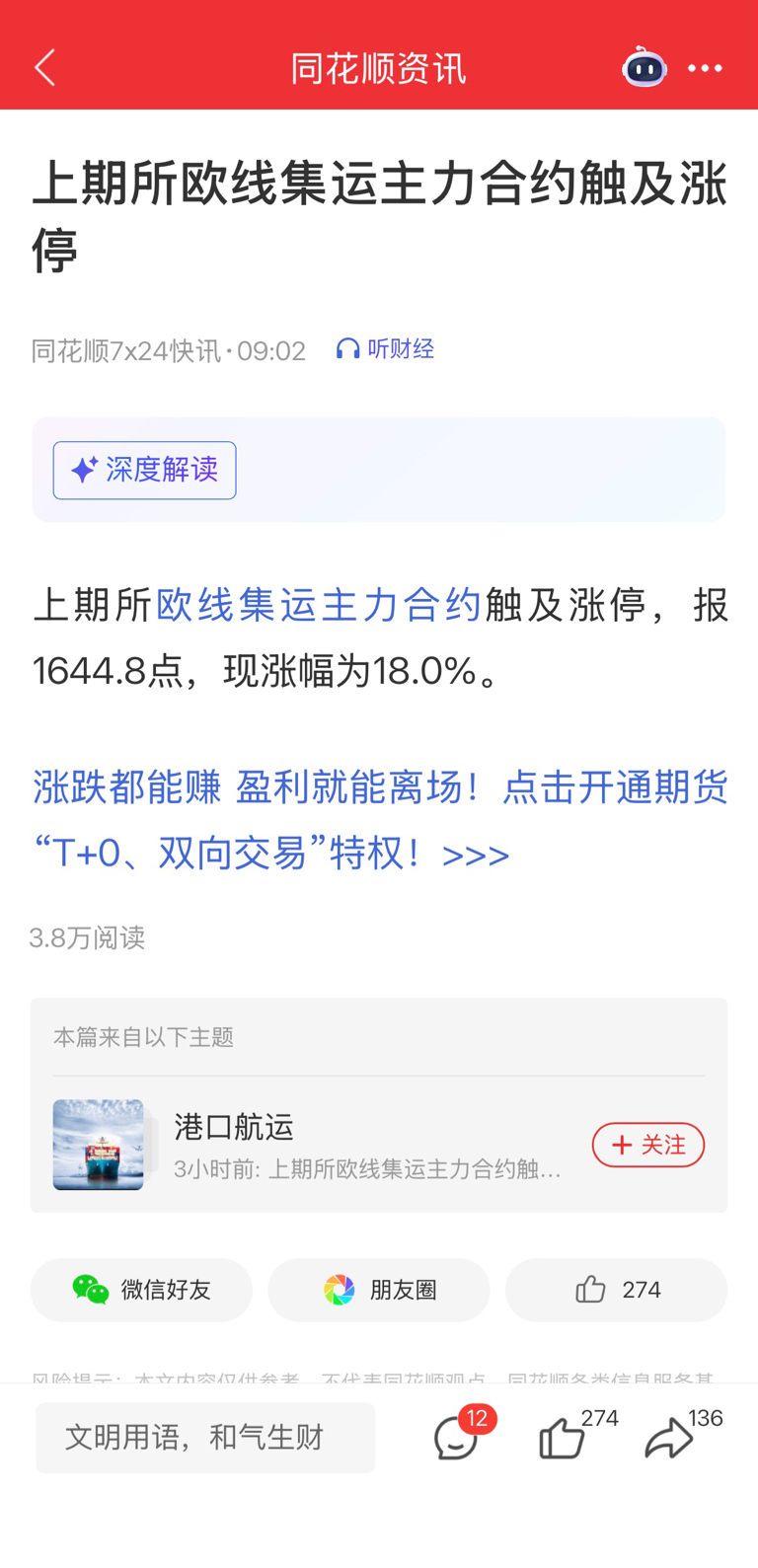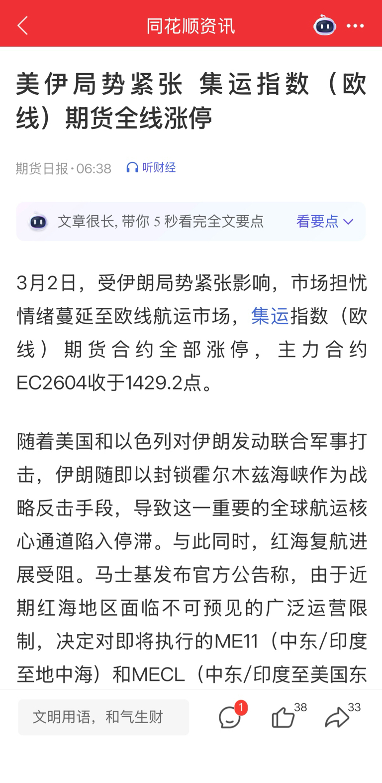 $中远海控(SH601919)$ #强势机会# #炒股日记# #实盘记录# 伊朗称:霍尔木兹海峡已关闭。预计关闭时间较长,航运运费大幅上涨,万手大单已入场中远海控,放心买入,短期目标冲击2 0元。欧线集运期指、中远海能、招商南油连续两天涨停。宁波海运、宁波远洋上午首板涨停。
