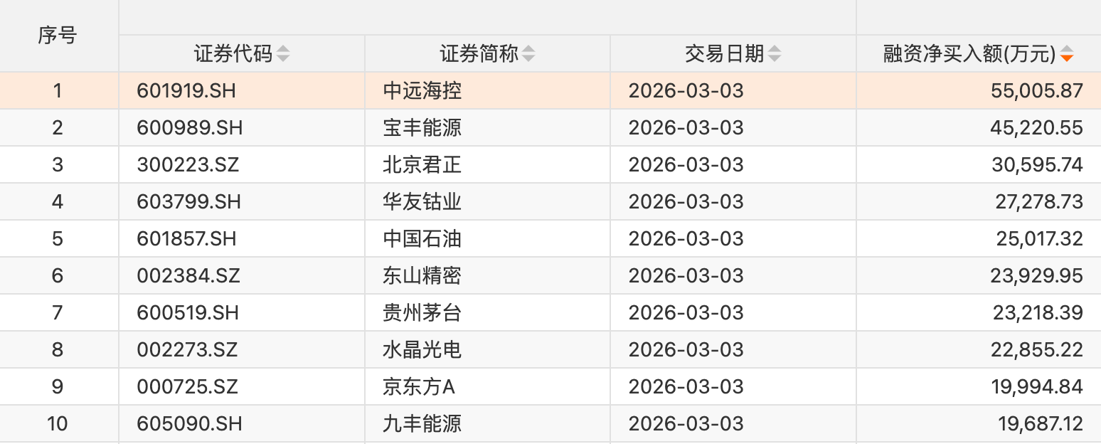 个股方面,36只个股获融资净买入额超1亿元。中远海控获融资净买入额居首,净买入5.5亿元;融资净买入额居前的还有宝丰能源、北京君正、华友钴业、中国石油、东山精密、贵州茅台、水晶光电、京东方A、九丰能源。