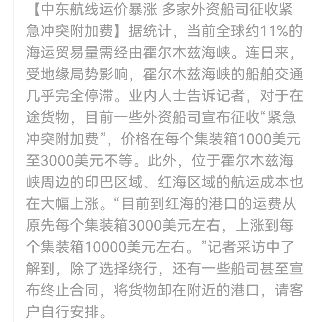 $中远海控(SH601919)$ 去波斯湾的绕去红海沿岸的港口,运价大涨