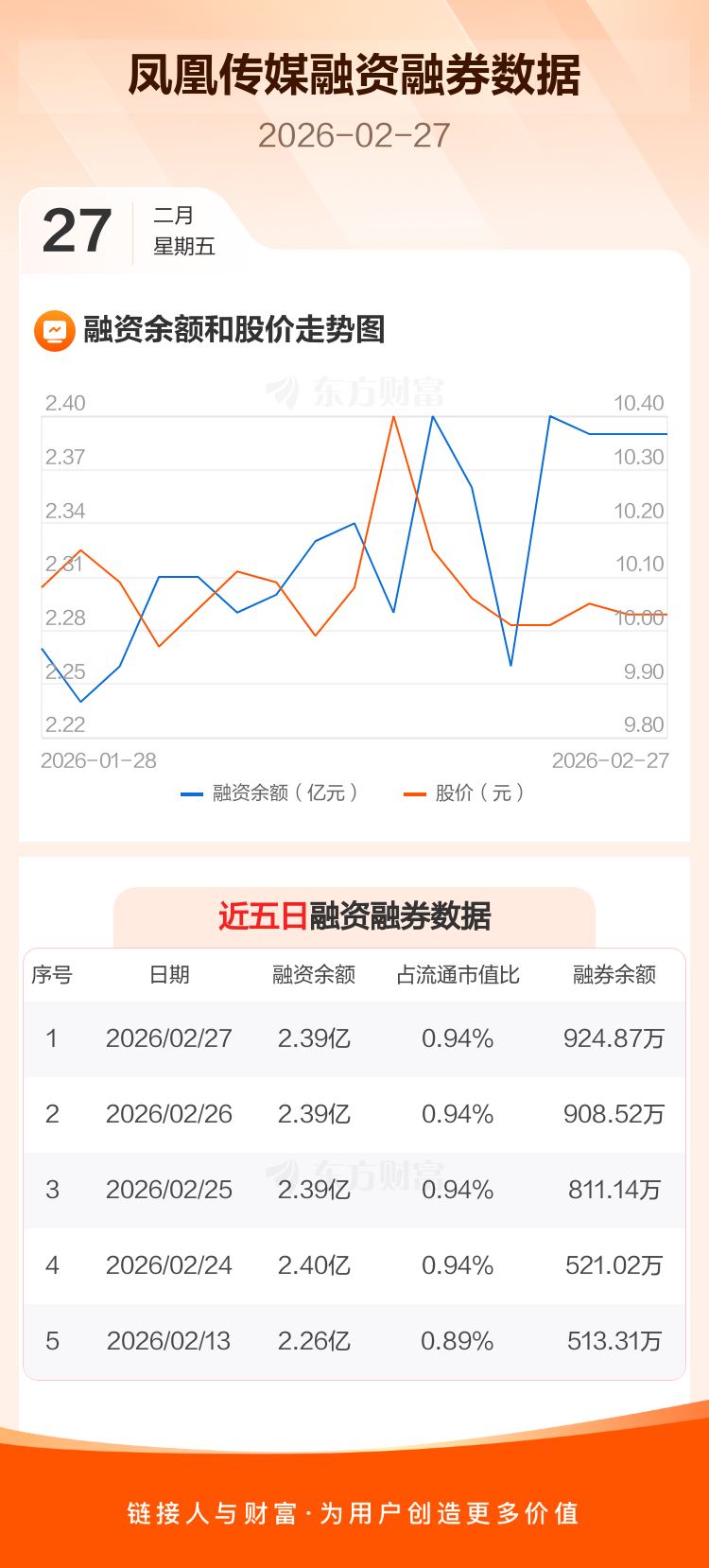 交易所最新数据显示,凤凰传媒于2026年2月27日获融资买入797.12万元,融资偿还768.11万元,当日融资净买入29.02万元。目前,该股融资余额2.39亿,占流通市值比例为0.94%。