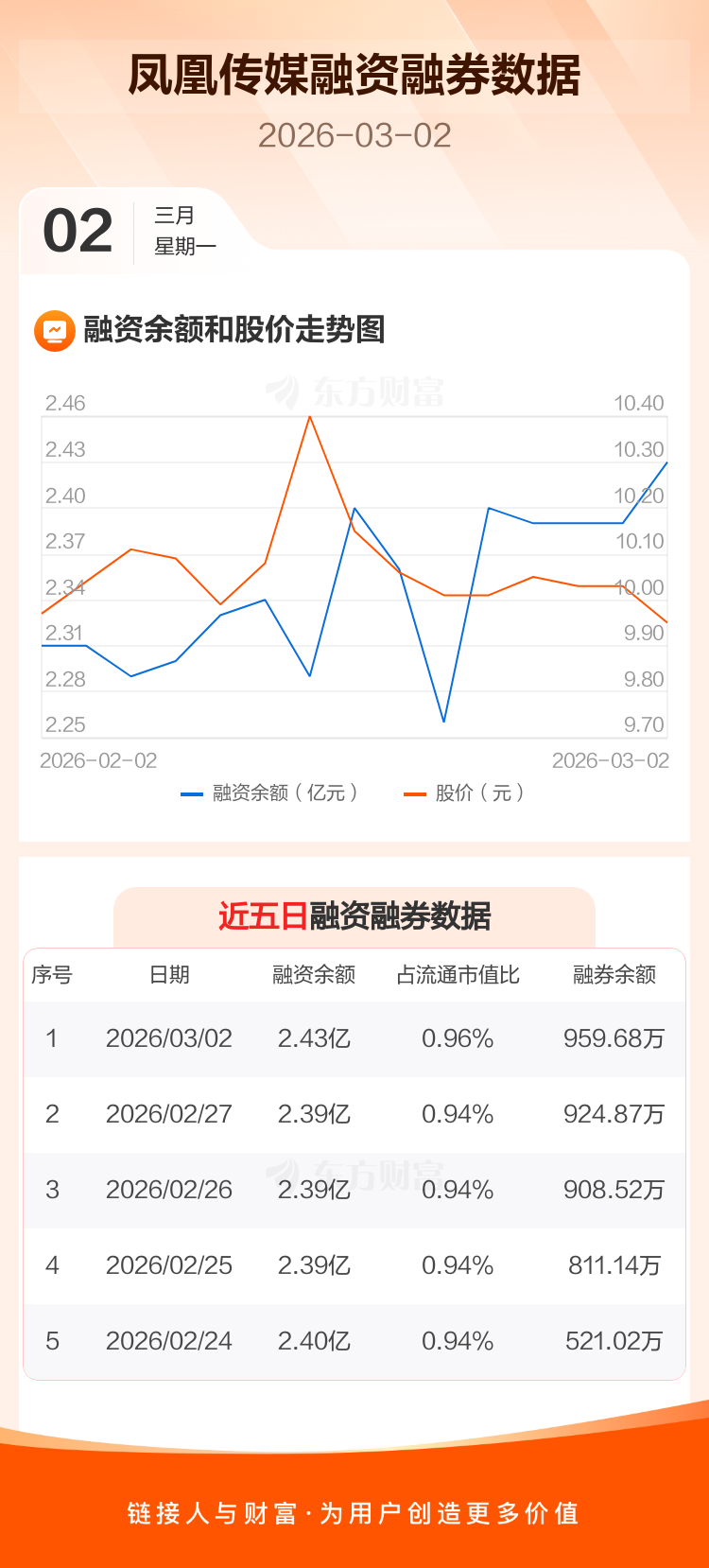 交易所最新数据显示,凤凰传媒于2026年3月2日获融资买入1585.81万元,融资偿还1256.51万元,当日融资净买入329.31万元。目前,该股融资余额2.43亿,占流通市值比例为0.96%。