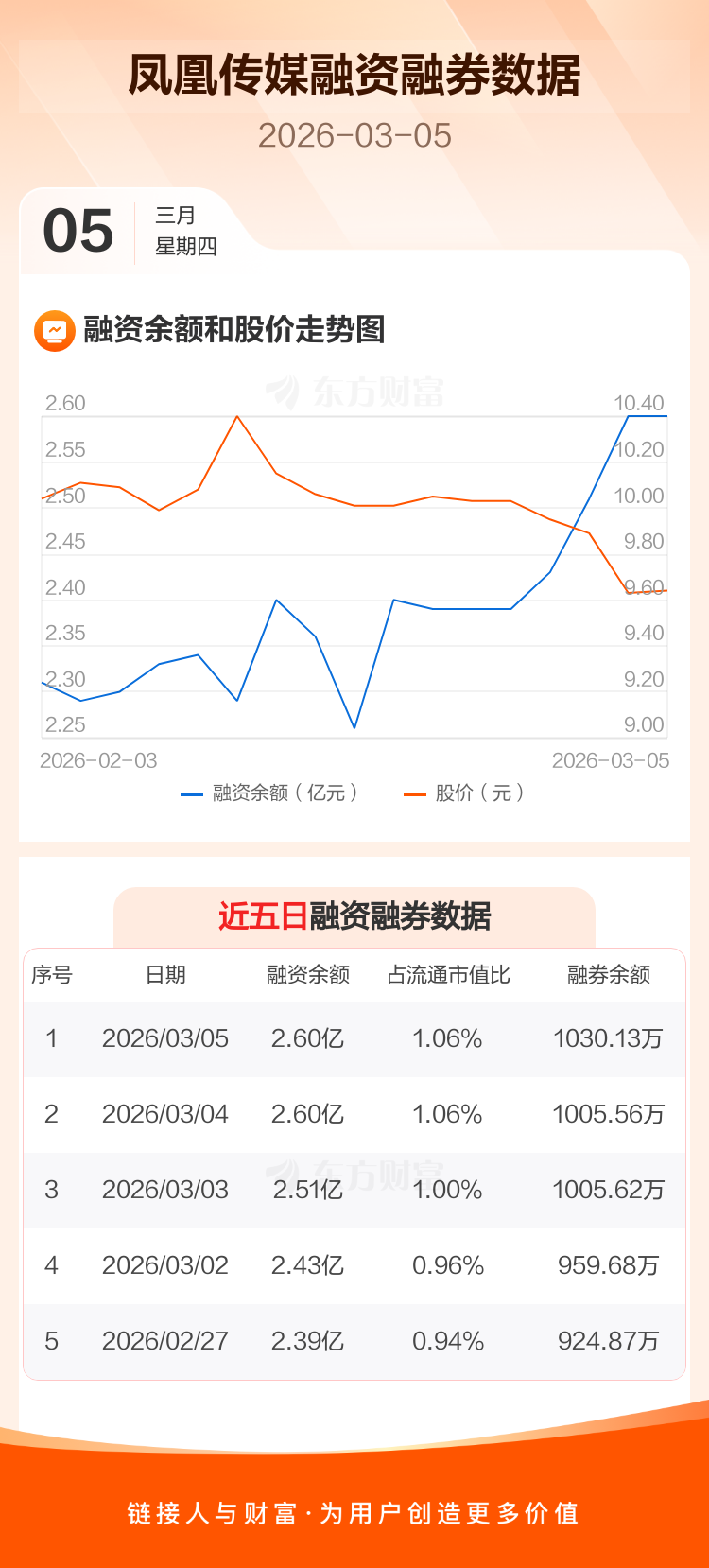 交易所最新数据显示,凤凰传媒于2026年3月5日获融资买入999.77万元,融资偿还984.17万元,当日融资净买入15.61万元。目前,该股融资余额2.60亿,占流通市值比例为1.06%。