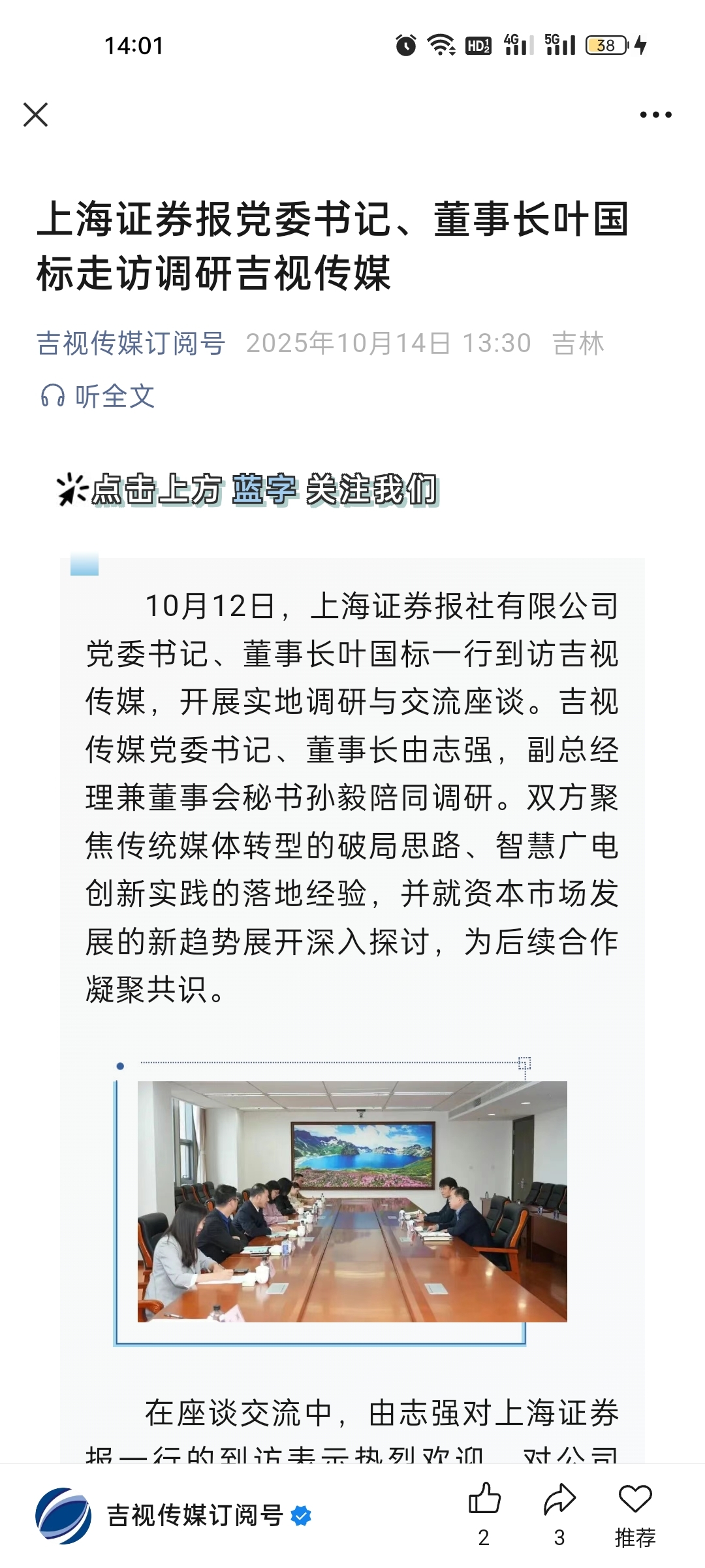 $吉视传媒(SH601929)$ 上海证券报党委书记董事长走访调研吉视传媒!